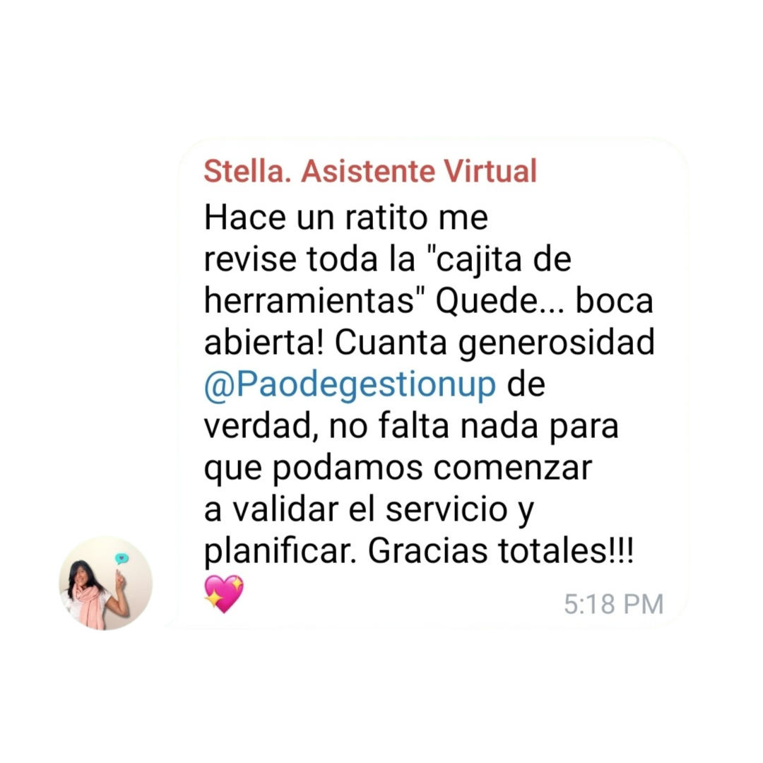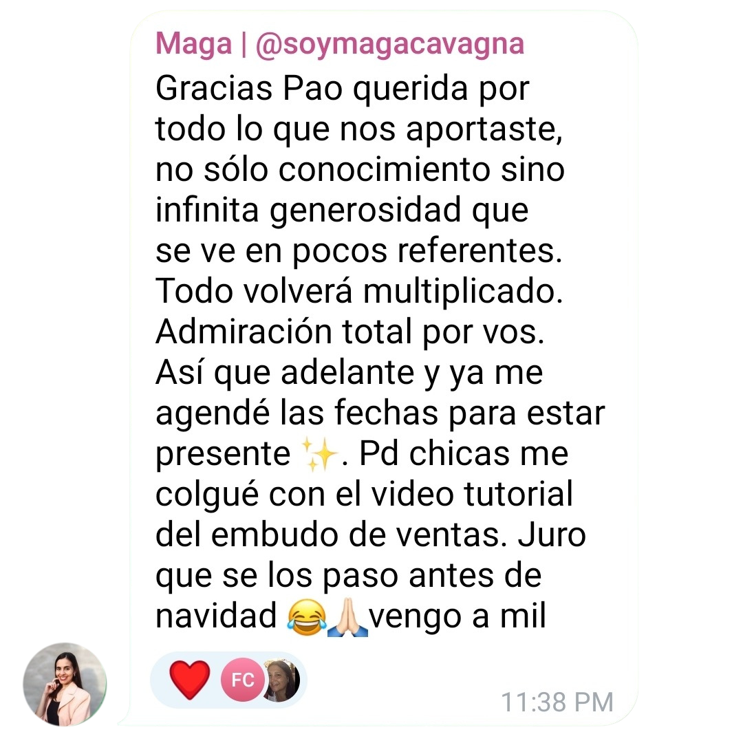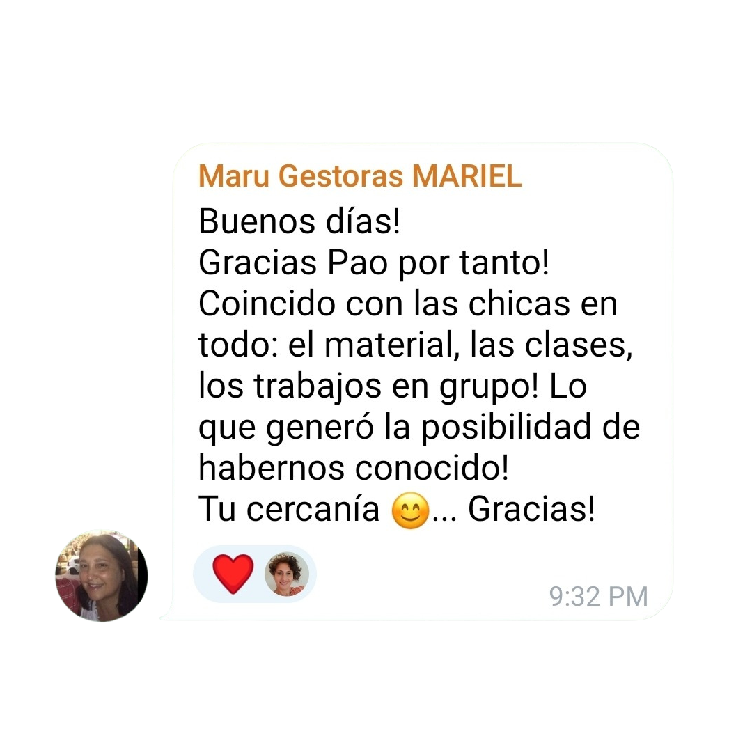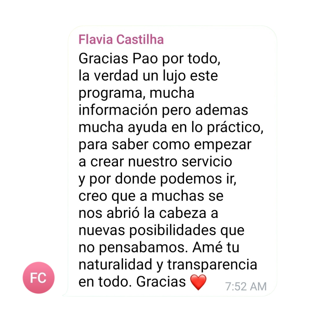 Me voy con claridad y organización, la formación es super completa, pao es muy generosa con el material, la información que comparte, todas las dudas que van surgiendo la va repindiendo permitiendo que vayas aplicando todo.